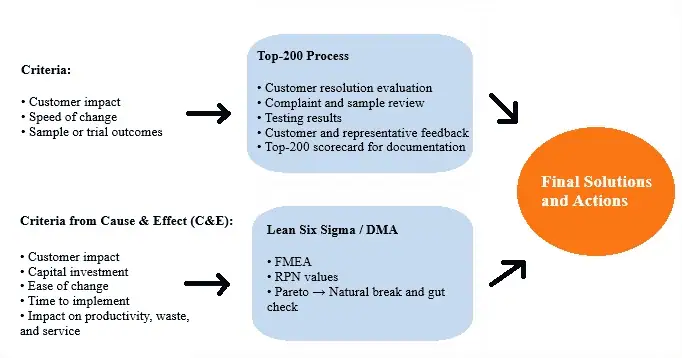 Les membres de l’équipe ont utilisé l’outil AMDE après les trois premières phases du cycle DMAIC pour créer un score ou une valeur de risque pour les solutions potentielles, celles ayant les scores les plus élevés étant les plus prioritaires. Les valeurs de risque ont été calculées en fonction de la gravité, de l’occurrence et de la détection de la défaillance ou de la variation de la variable du processus ou du produit. Les critères de sélection des solutions finales étaient similaires pour les approches Top-200 et Lean Six Sigma et incluaient les résultats des essais, l’impact attendu sur les clients, la rapidité et la facilité du changement, ainsi que les coûts de mise en œuvre. Comme le montre l’illustration, l’équipe a sélectionné les solutions finales pour l’approche Top-200 en procédant à une évaluation de la résolution du problème par le client, ce qui impliquait d’examiner les réclamations, les échantillons, les résultats des essais et le retour d’information de la part du client.